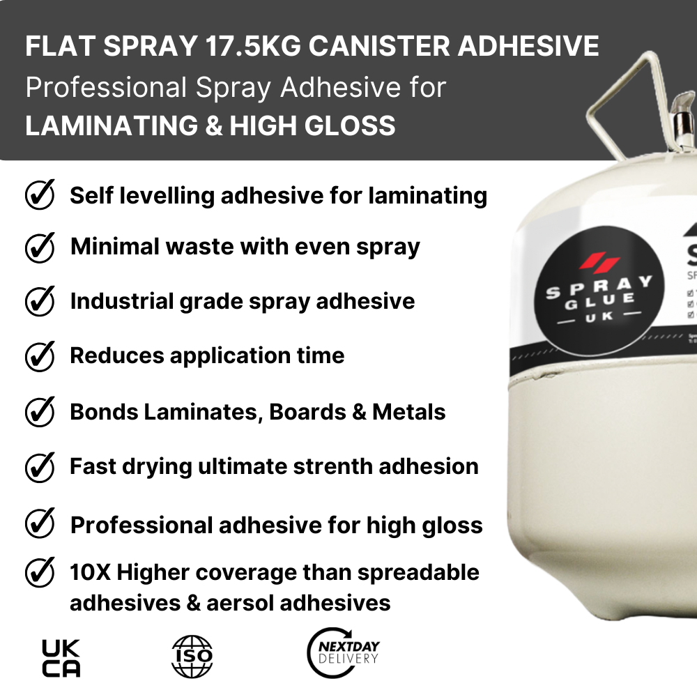 Flat Spray contact adhesive canister (17.5kg/ 22L) is designed for bonding many substrates with superior high coverage ensuring a permanent bond including ultra thin laminates, MDF, high gloss laminates, veneers, plywood, metal, wood to all materials, Spray Glue UK Flat-Spray Contact Adhesive Canister is the industry’s first choice for professional joiners, fabricators laminators & manufacturing.